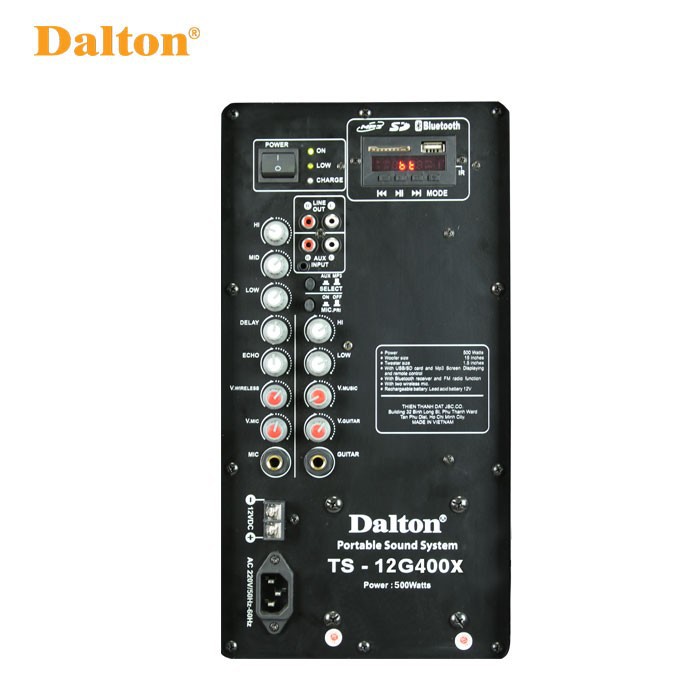 Loa kéo di động Dalton TS-12G400X sử dụng bình acquy 12V, sử dụng liên tục từ 3 – 5 tiếng cho cuộc chơi của bạn được xuyên suốt. Đặc biệt, bạn có thể cắm điện 220V trực tiếp để dùng.