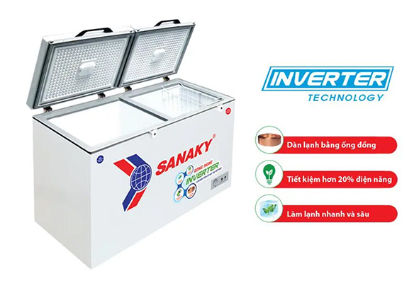 - Tủ đông Inverter Sanaky VH-2899W3 sử dụng dàn lạnh bằng đồng cho hiệu suất làm lạnh nhanh và sâu hơn so với dàn nhôm. Kết hợp quạt đảo nhiệt giúp hơi lạnh ổn định và đều khắp bên trong tủ.